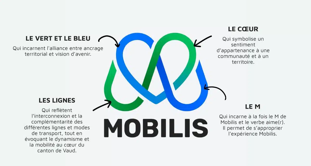 Enfin, le choix d’un filet dégradé du bleu au vert souligne la dynamique du territoire vaudois et la transition énergétique que porte Mobilis à travers ses projets de mobilité.